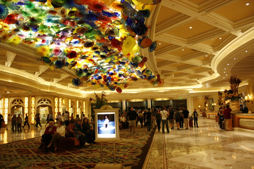 Inside Bellagio, Dale Chihuly's Fiori di Como, composed of over 2,000 hand-blown glass flowers, covers 2,000 sq ft (190 m2) of the lobby ceiling. Bellagio is home to Cirque du Soleil's aquatic production "O".